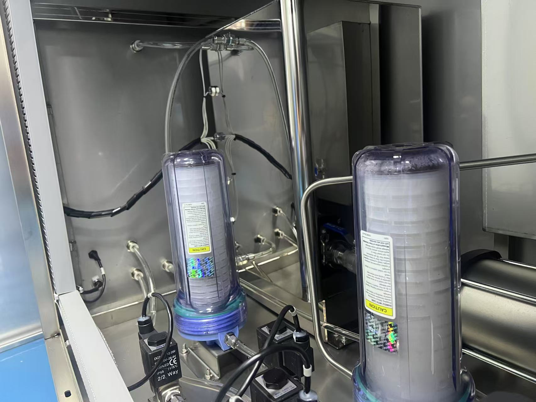 Внутри оборудования устанавливаются два жидкостных фильтра, и моющее средство подается из резервуара для хранения через насос под давлением. Оно проходит через фильтрующий элемент с точностью фильтрации 0,2 мкм, что гарантирует чистоту жидкости, используемой для очистки компонентов. Перед возвратом моющего средства в резервуар для хранения через мембранный пробоподготовитель оно фильтруется с точностью фильтрации 1,0 мкм, что гарантирует чистоту жидкости в резервуаре.