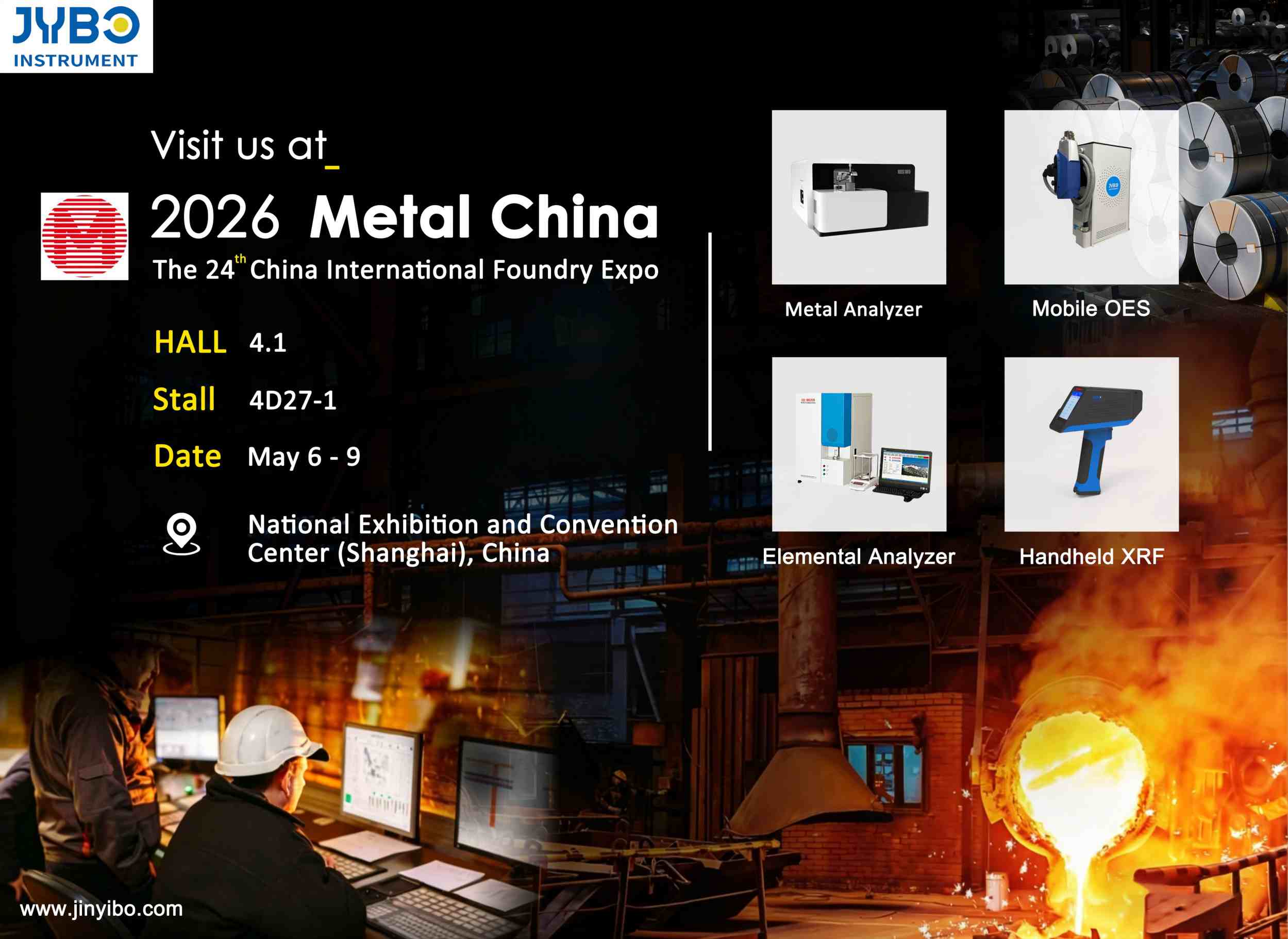 На этой выставке компания Jinyibo представит полный ассортимент аналитических приборов, а также решения для PMI-тестирования и анализа материалов, разработанные для литейного производства с целью удовлетворения требований отрасли к быстрому тестированию на месте, точному элементному анализу и идентификации марок материалов.