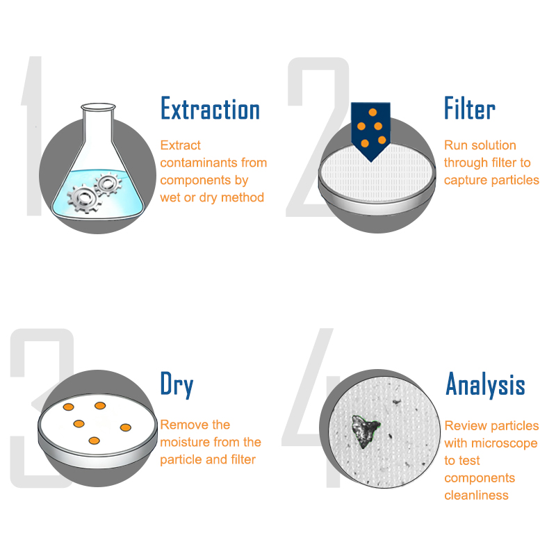 Процесс проверки чистоты JYBO CleanTech полностью соответствует международным стандартам чистоты, включая VDA19, ISO16232 и другие отраслевые стандарты.